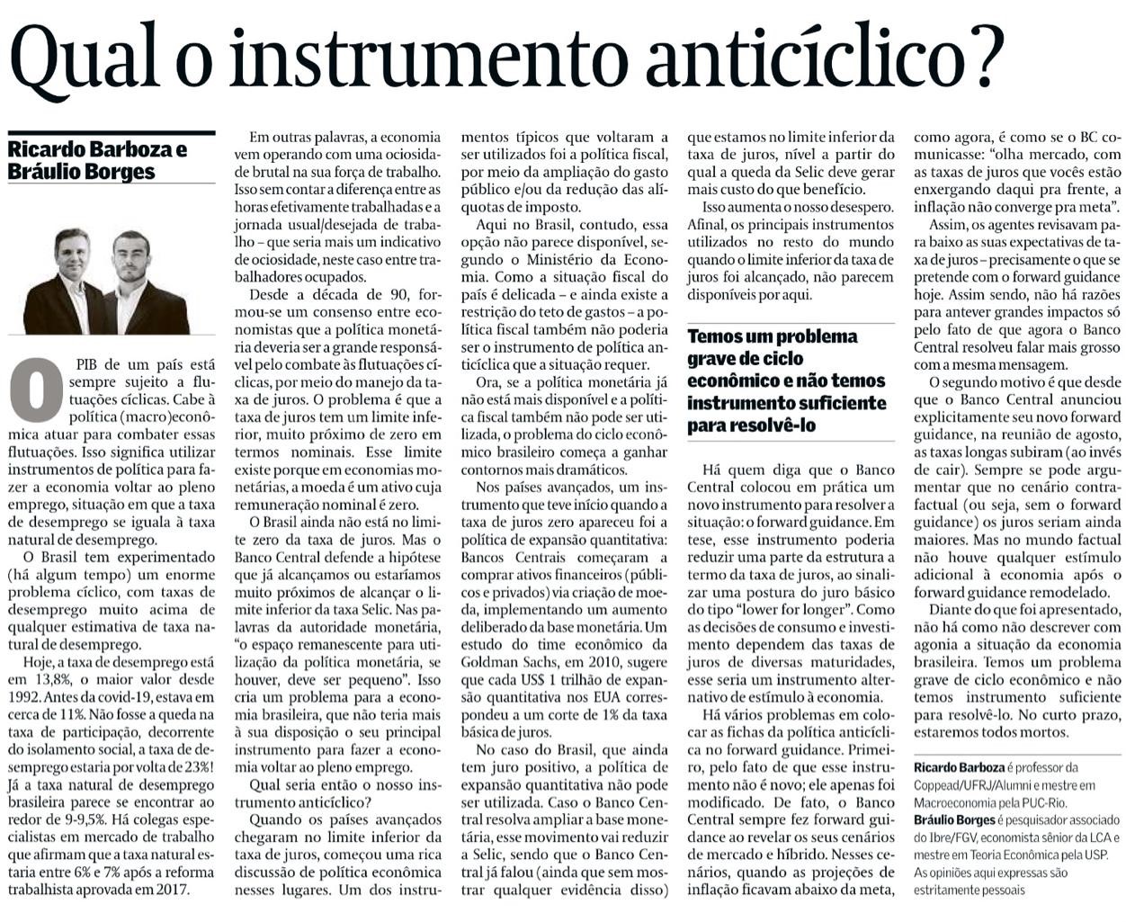 50- Artigo no Valor Econômico, em parceria com Bráulio Borges (out/20): Qual o Instrumento Anticíclico